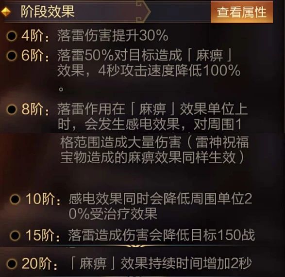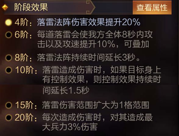 技能介绍:进入战斗5秒后,在战场布置持续5秒的落雷阵,每秒劈下一道落雷,对随机敌方单位造成我方攻击最高武将攻击力的一定量伤害。