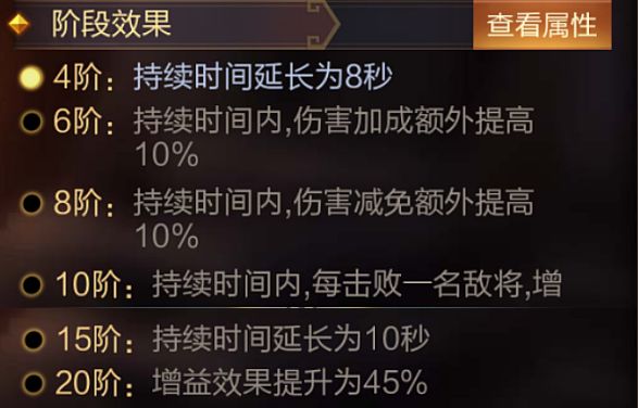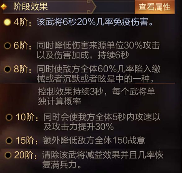 技能介绍:开场前6秒,所有武将提升21%伤害加成及21%伤害减免。