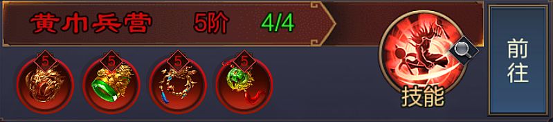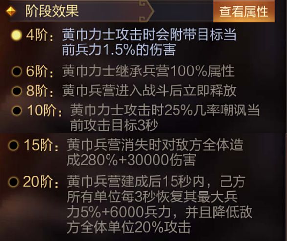 技能介绍:进入战斗10秒后,立即放置一个30秒的黄巾兵营,每隔10秒召唤1名黄巾力士,黄巾力士随机选取攻击目标,受到伤害时反弹10%伤害。