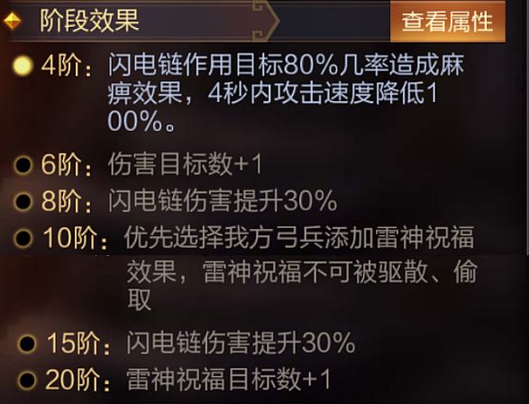 技能介绍:开场随机2名武将获得雷神祝福效果,普攻时30%几率触发闪电链,对最多3名敌方单位造成115.2%+4800伤害。(同一个目标不可被同一条闪电链连续击中)。
