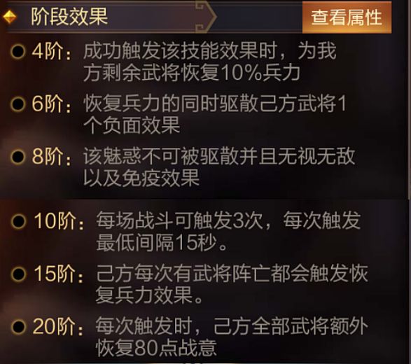 技能介绍:己方武将阵亡时,50%几率对敌方攻击力最高武将造成3秒「魅惑」效果。每场战斗可触发1次。