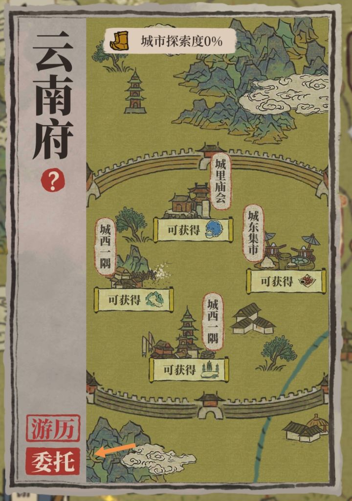 下面重点来了(佛系玩家可以跳过了)时间有限,我们要尽可能多的获得盘缠,这样才能游历城中地点和去新城市,所以尽可能早的去到最高档城市做委托,可以一直刷盘缠,在最后一次性游历。