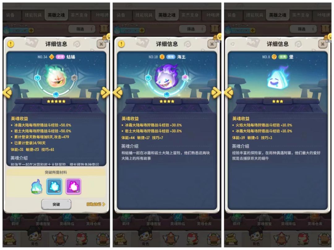 - 英雄之魂 英雄之魂的效果是按照大陆来区分,不同的大陆有不同的英雄之魂。如图,英雄之魂的获取只有氪金礼包。
