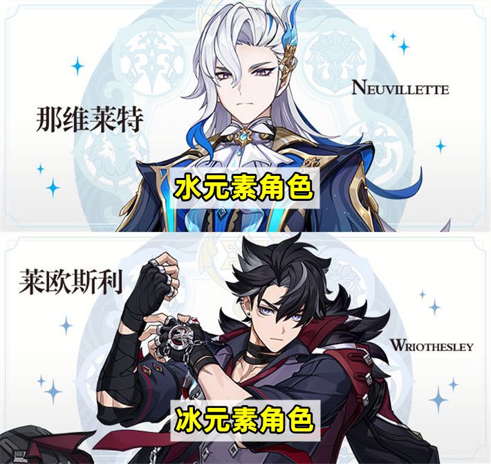 官方已经公布了那维莱特和莱欧斯利的立绘,两人的元素属性分别是水和冰,除了枫丹通用的生命值主词条外,水伤杯和冰伤杯自然也有可能会用上。
