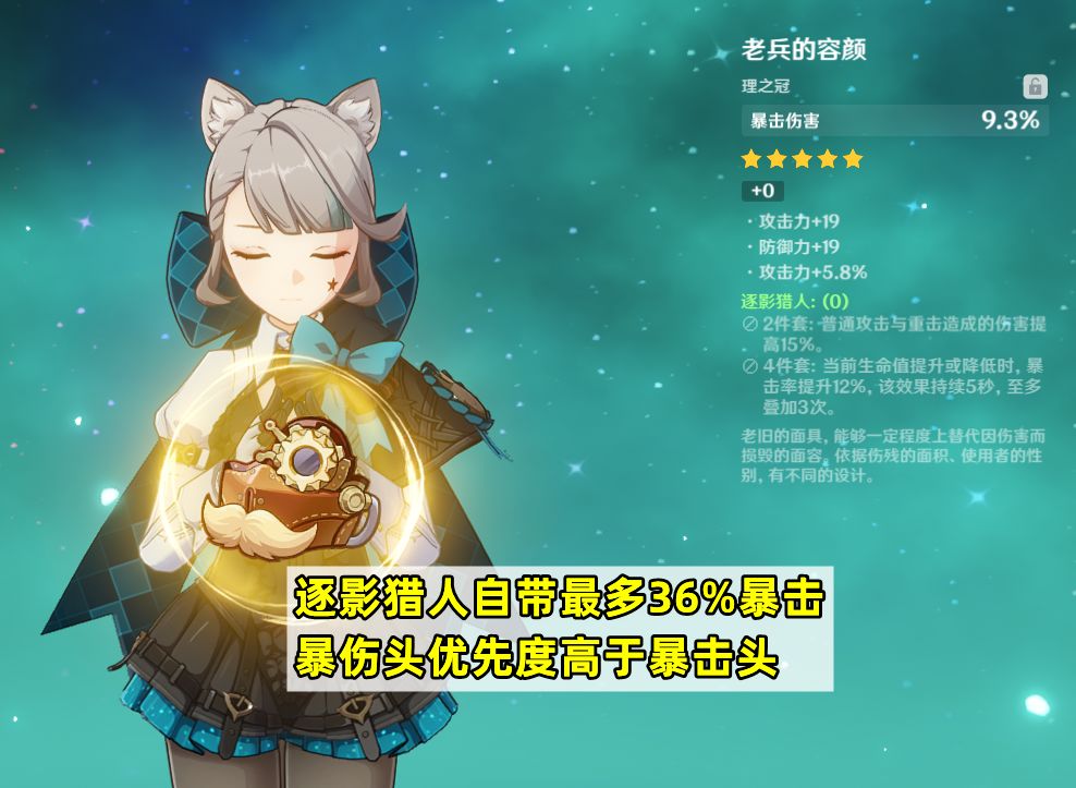 其次,枫丹是水之国,那么水伤杯自然也是优先保留的一档,那维莱特和水神芙宁娜都有可能会用上。最后,惯例的双暴头自然少不了,不过需要特别提醒下,因为逐影猎人套本身就能加36%暴击,所以这一套的暴伤头优先度要高于暴击,哪怕副词条没有暴击的暴伤头也有机会用上。