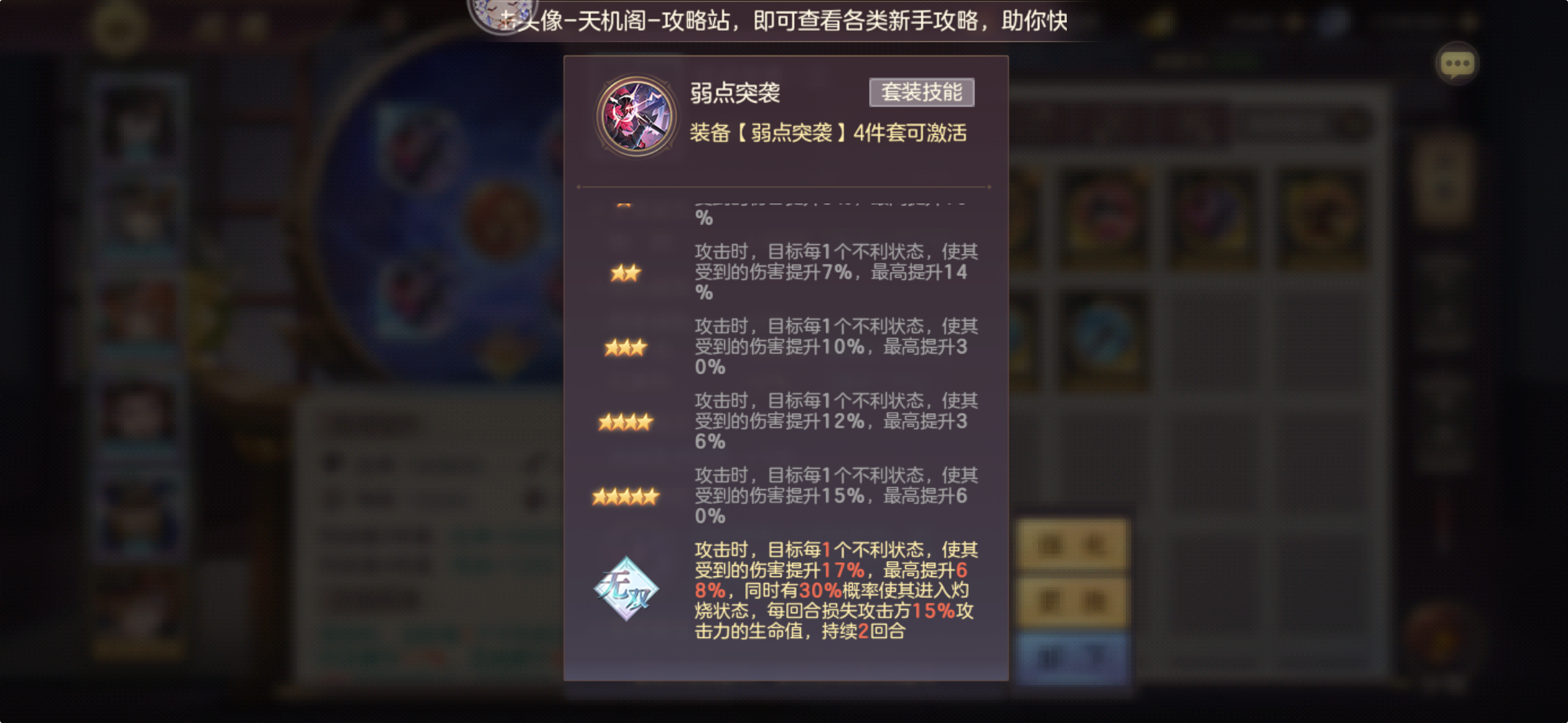 构建思路:弱点突袭4层提供68%的增伤,迅速秒掉后排触发神兵结束战斗