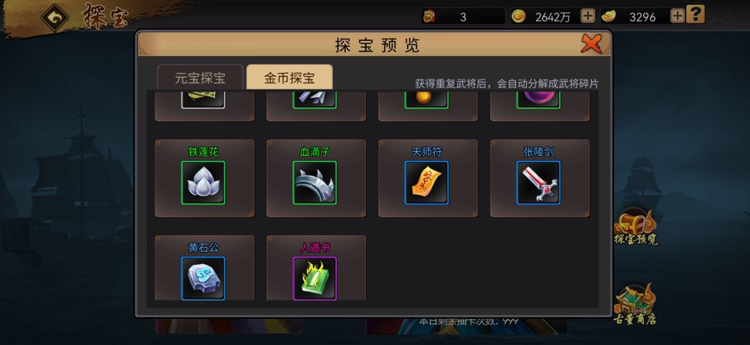 探宝设定:系统每天赠送5次免费金币探宝机会;单次金币探宝花费10000金币,从最初的十连探宝发展到如今的百连探宝,连抽可以享受9折优惠。每20次金币探宝必出一个1-3星的武将碎片,每百次必出一个整将星将,其中每进行一次金币探宝会获赠一个古币,可在古董探宝商店兑换星将碎片和传说品质装备原石等资源。