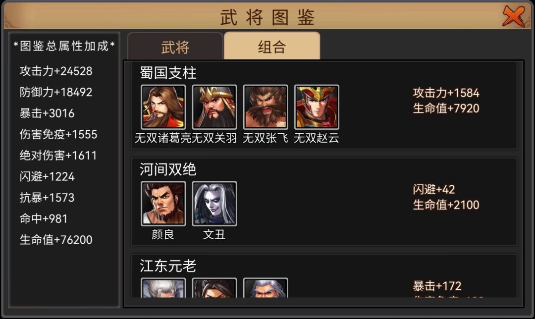 探宝设定:系统每48小时赠送一次元宝探宝机会,单次元宝探宝花费180元宝,十连抽则会在原基础上给予9折优惠。每10次元宝探宝必出一个3-5星的整将星将,元宝探宝有概率出现皇冠整将,新手玩家初始80次必出冠将,后续120次必出冠将。目前开放了三大冠将奖池总计15名冠将,每次探宝仅可以选择其中一个奖池抽奖。其中不乏一些历久弥新的武将如无双庞统和孙权,还有一些大组合图鉴集成者(无双诸葛、无双张飞、无双马超、司马懿、张春华、贾诩、荀彧、孙策、孙坚等)。
