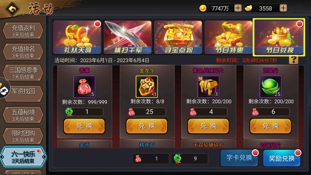 3.我们也要有预留金龙令的习惯,因为大型节日的活动现场,节日挑战任务中就有可能需要每日完成两次古董探宝,这时预留金龙令的习惯作用性就体现出来了,可以让我们在节日盛典中免费获取到更多的资源。而且一些字卡活动经常会遇到元宝探宝活动,在满足一定的探宝次数后还会得到额外的奖励,这时我们把日常积累的金龙令一起拿出来使用回报率相对较高,额外奖励的皇冠武将碎片随机宝箱反正是送的,有拿白不拿!