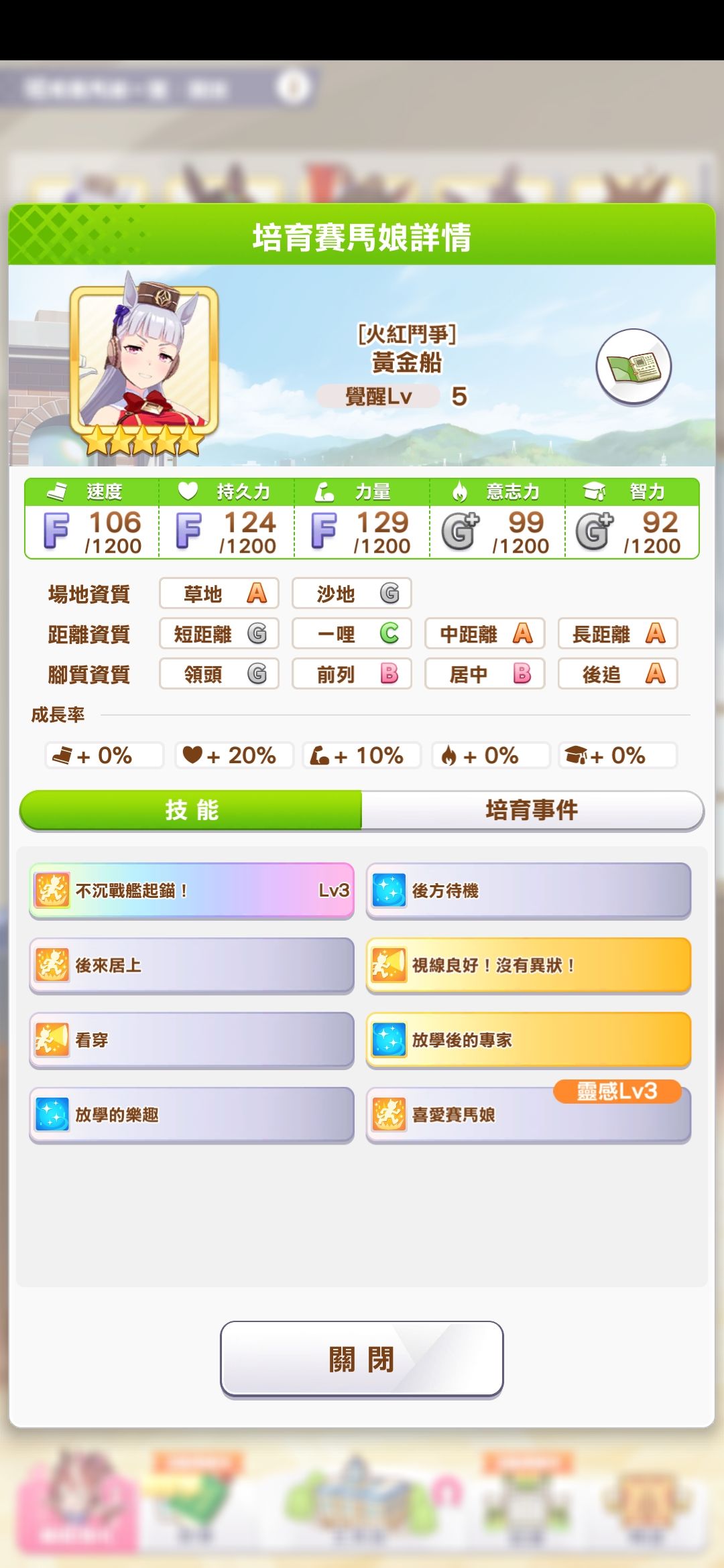 再回来说黄金船,因为赛程里有两个重量级长距离,因此需要耐力属性,按照经验来看,菊花400以上的耐+一个金回(超级溪流的金技能,圆弧的艺术家,或者船本身的放学后专家)基本很稳,天王奖春600耐+一金回,因此你需要做的就是在这些比赛之前把耐力优先拉到门槛,然后尽可能的堆高速度和另外两个副属性。鉴于船的速加成是0,可能比较难拉速,因此卡不好的可能就要4张速卡,卡好一点的就3张,不过船的耐力加成是20,所以耐卡就可以只带一张海湾,不放心的就再加一张,这样你六张卡的大部分位置就定好了。