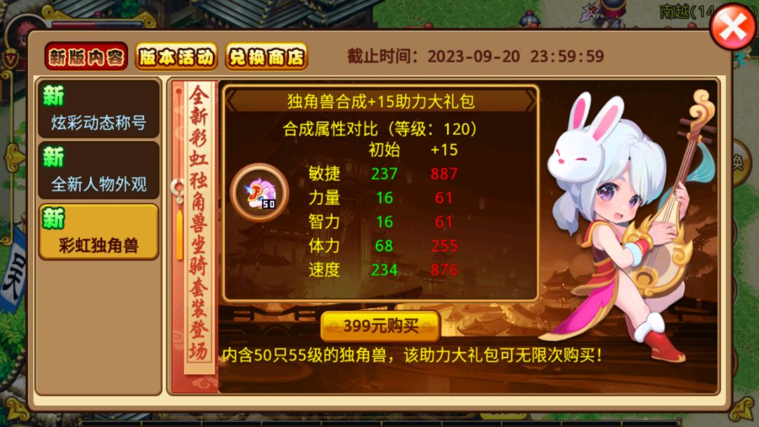 彩虹独角兽将会是当前版本属性最强的坐骑,没有之一!初始属性,合成属性加成,升级属性加成均全面提升!