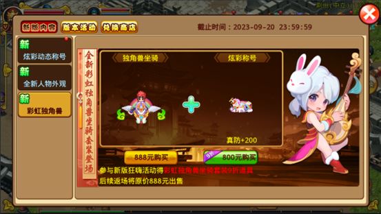 独角兽套装内含:彩虹独角兽坐骑1只+独角兽炫彩称号(真防+200)