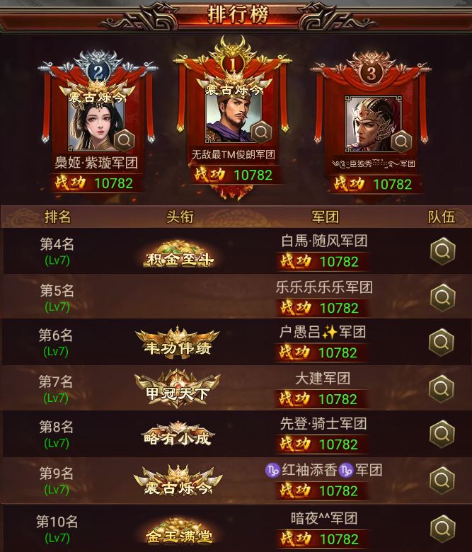 本期潼关之战中赢得第一位的是 无敌最TM俊朗 军团。