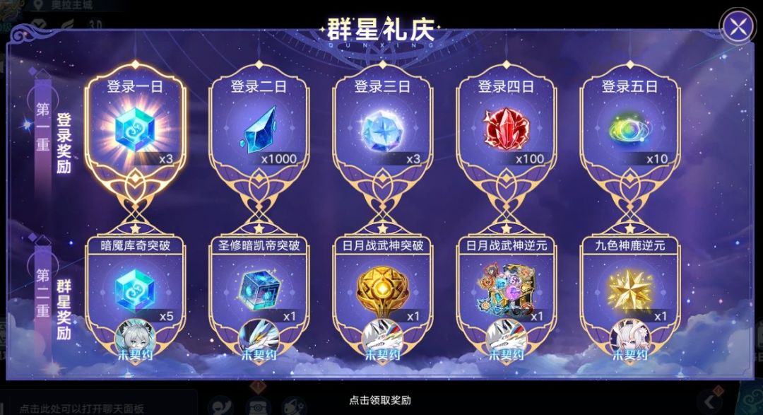 2.累计登录还将开启群星挑战,在群星挑战中,通过挑战即可获得关卡奖励;