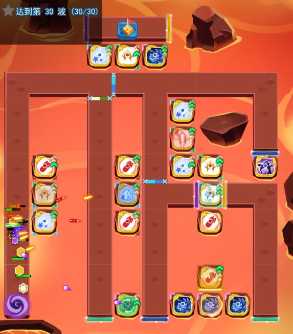 这一关很容易防守不住生机魔物,所以在放置几个核弹和流星后,优先将战神炮塔摆满,升级顺序应该根据场上形式来判断,核弹,流星和战神炮塔优先升级,飞花炮塔不用浪费sp。