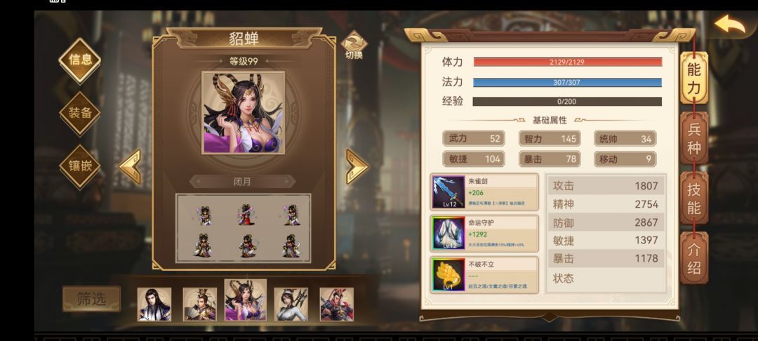 8.专属貂蝉,携带朱雀剑+命运+不破不立,集必中、慌骗、不屈于一体