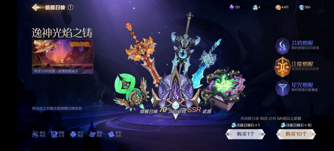 在我们进入游戏时,我们能够从邮件里面领取到大量钻石和注能召唤石。在注能熔醒中利用注能召唤石抽取武器。每十次必能获得一把SR武器,还可能获得一些武器碎片,元素晶核和技能残页;当熔醒召唤达到70次必能获得一把强力的SSR武器。