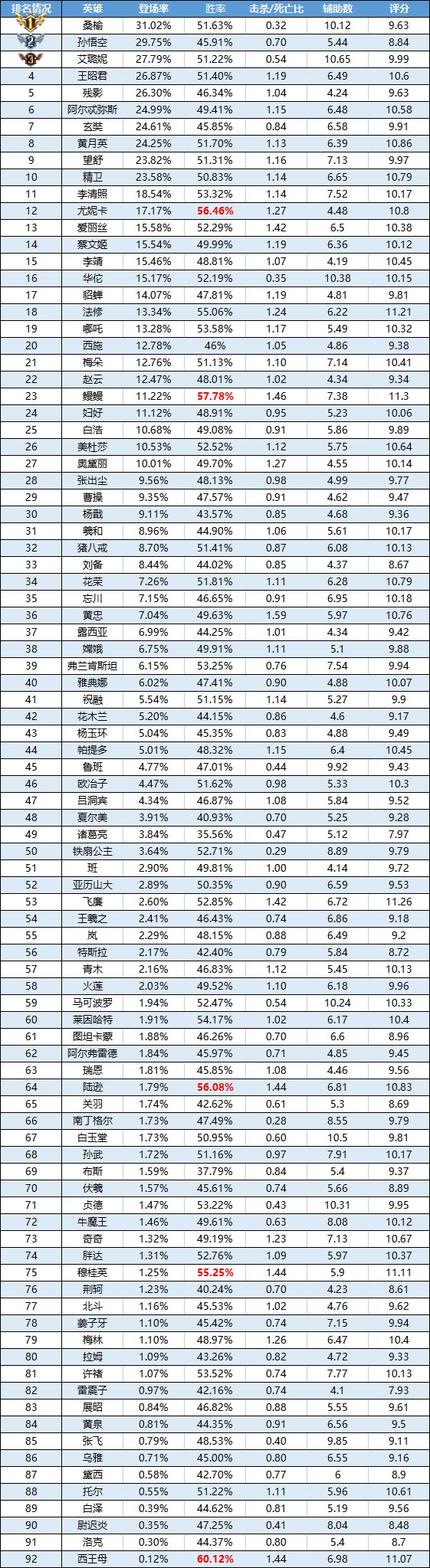 本周,鳗鳗胜率在殿堂级以上段位中击败西王母,取得top1;孙悟空终于摆脱小黑屋首席的位置,登场双榜均为前3,也算是熬出头了!不过,鳗鳗本周在ban榜上又前进一名,成为TOP2,难道下一个ban榜常客是鳗鳗吗?