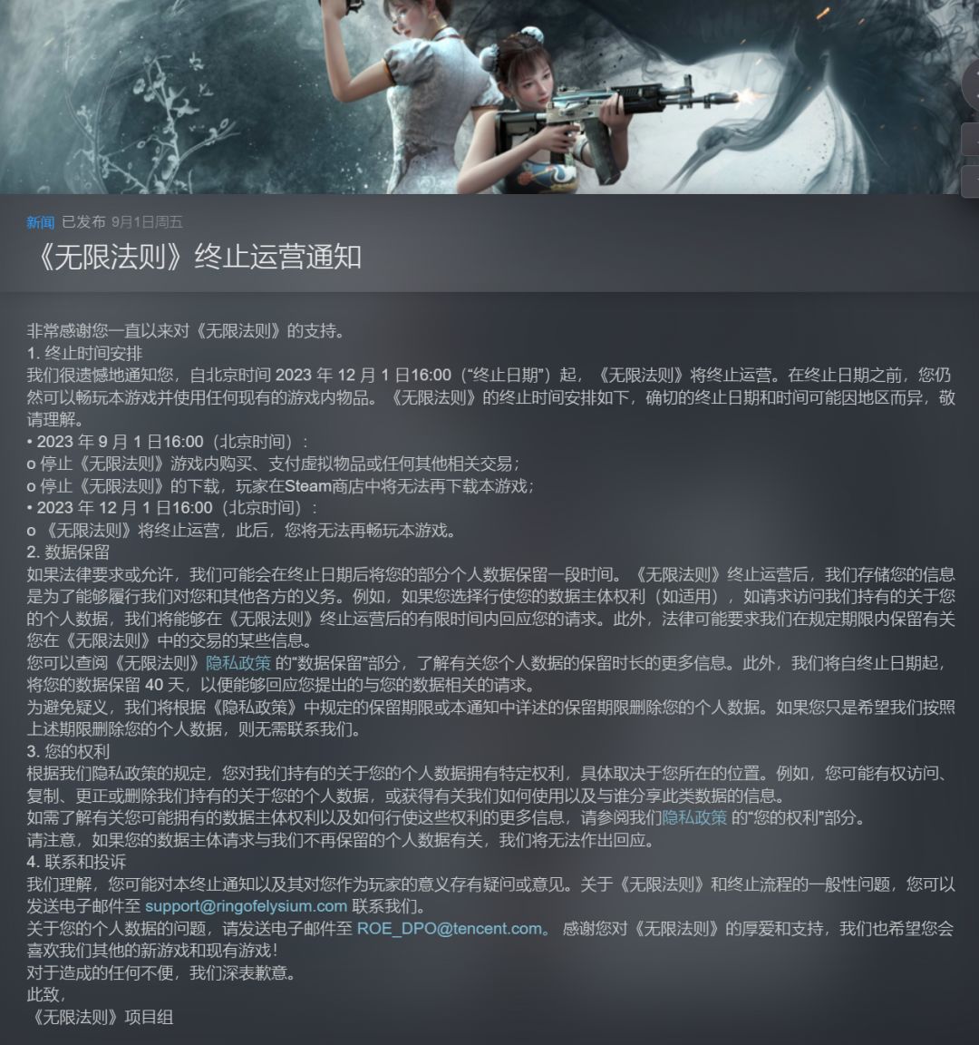9月1日,由腾讯北极光工作室研发的战术竞技射击端游《无限法则》,在Steam社区及官网发出通知,表示将于12月1日终止运营。目前,玩家已无法在Steam上下载此游戏,已下载游戏的玩家也无法进行内购。