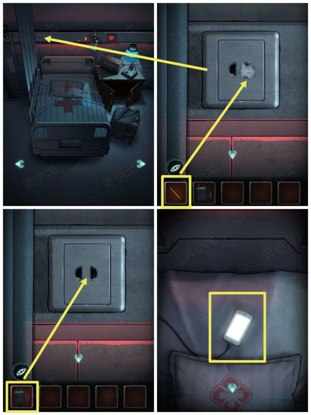 7.(病床)点击插孔,用【牙签】弄掉插孔上的口香糖,插上【充电设备】充手机,点击手机,接听电话