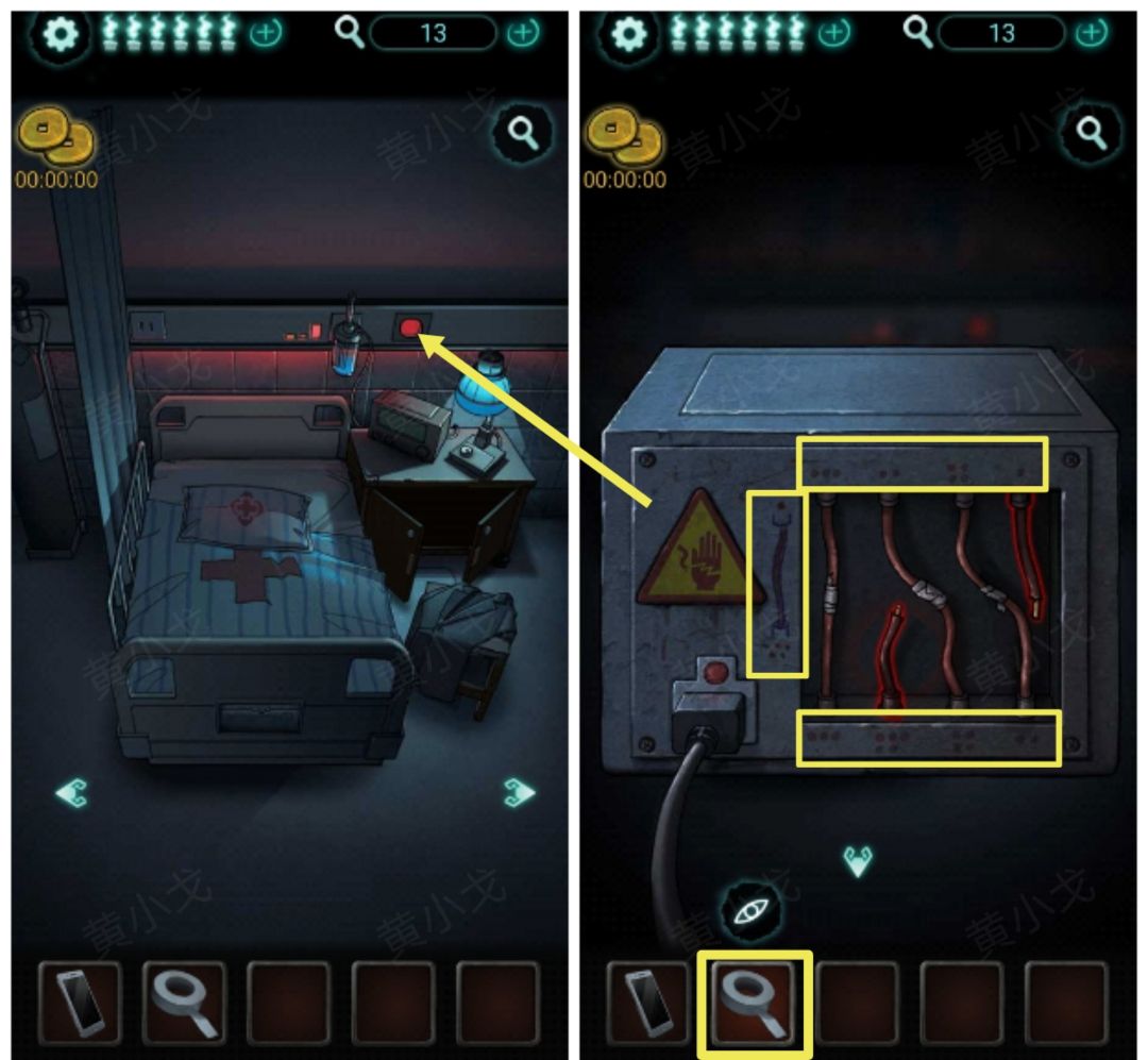 24.(病床)点击电箱,用【绝缘胶带】粘好电线(旁边有提示上1接下5,所以就是上面的点数➕下面的点数=6。很坑的,一点错就得看广告)