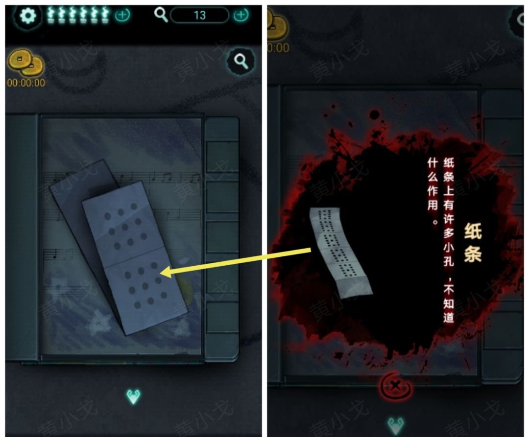 12.(房门)点击地上的纸条,使用【手机】。获得线索(从高到低箭头:左←、右→、上↑、左←、上↑)