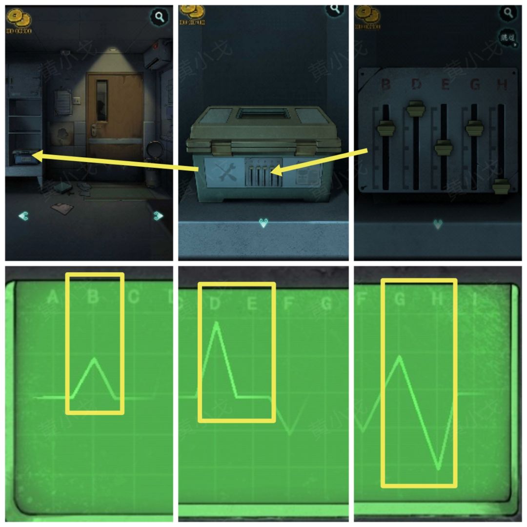 26.(房门)点击柜子上的工具箱,根据上面的提示(BDEGH),结合仪器上的线索,调整滑块的位置(从上到下:B-2、D-1、E-3、G-2、H-5)