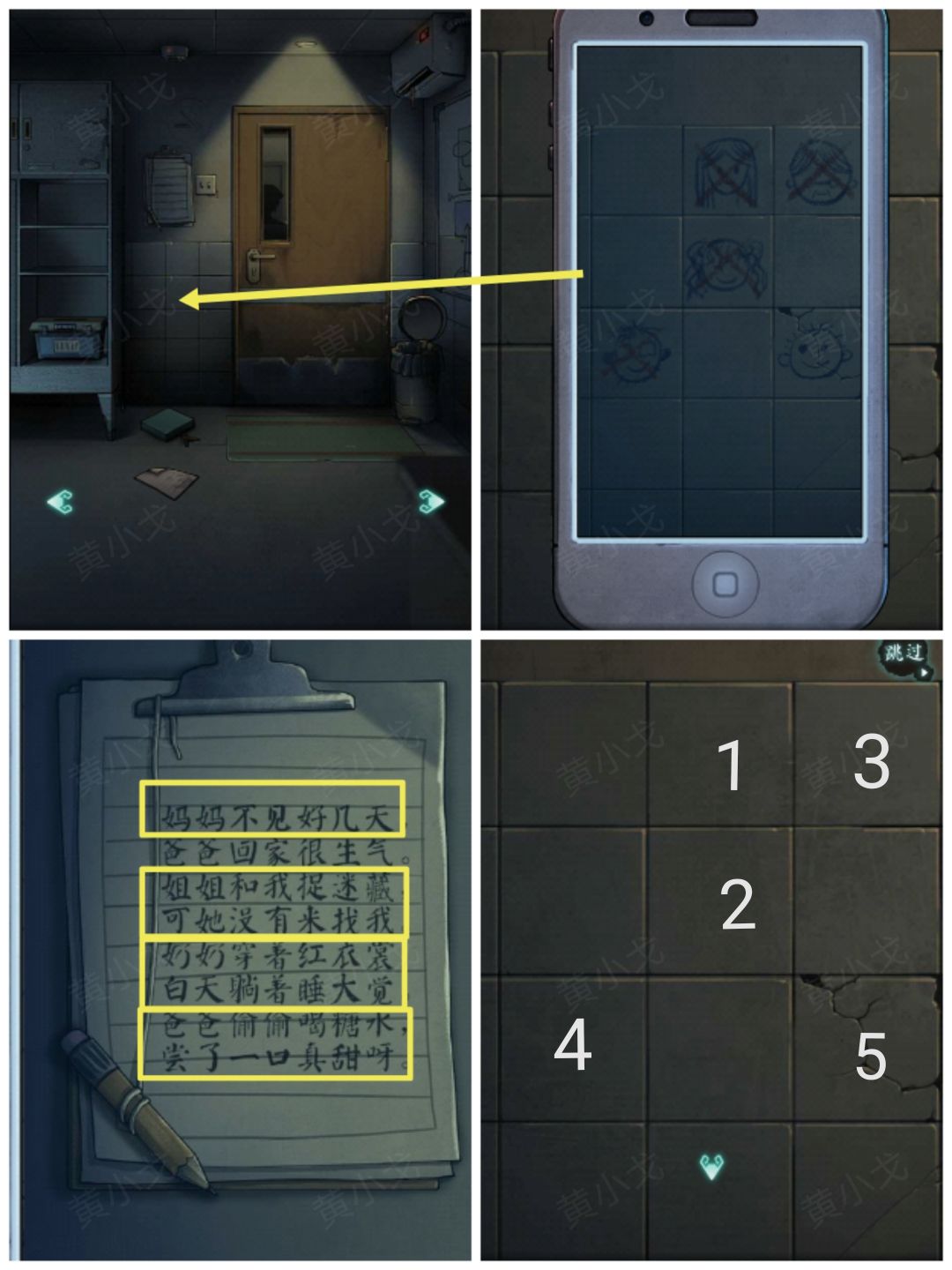 14.点击门左边的的瓷砖,使用【手机】(记住人物的位置);根据记录本上的线索(人物死的顺序),按顺序按下人物对应的瓷砖(妈妈、姐姐、奶奶、爸爸、我)