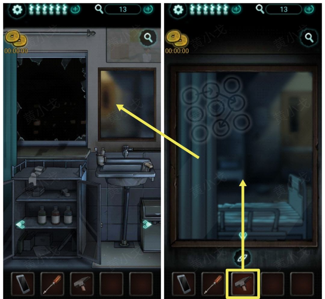 28.(洗手台)点击镜子,用【锤子】砸镜子