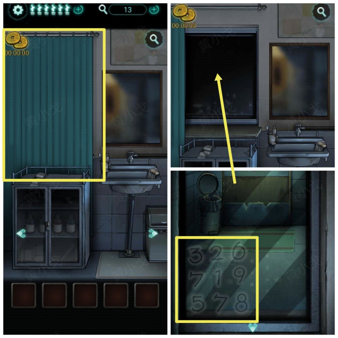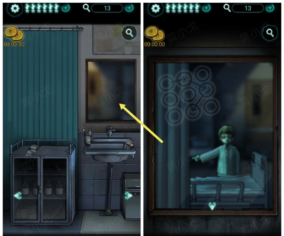 9.(洗手台)点击镜子,获得解锁手机的手势密码(有小高能?)