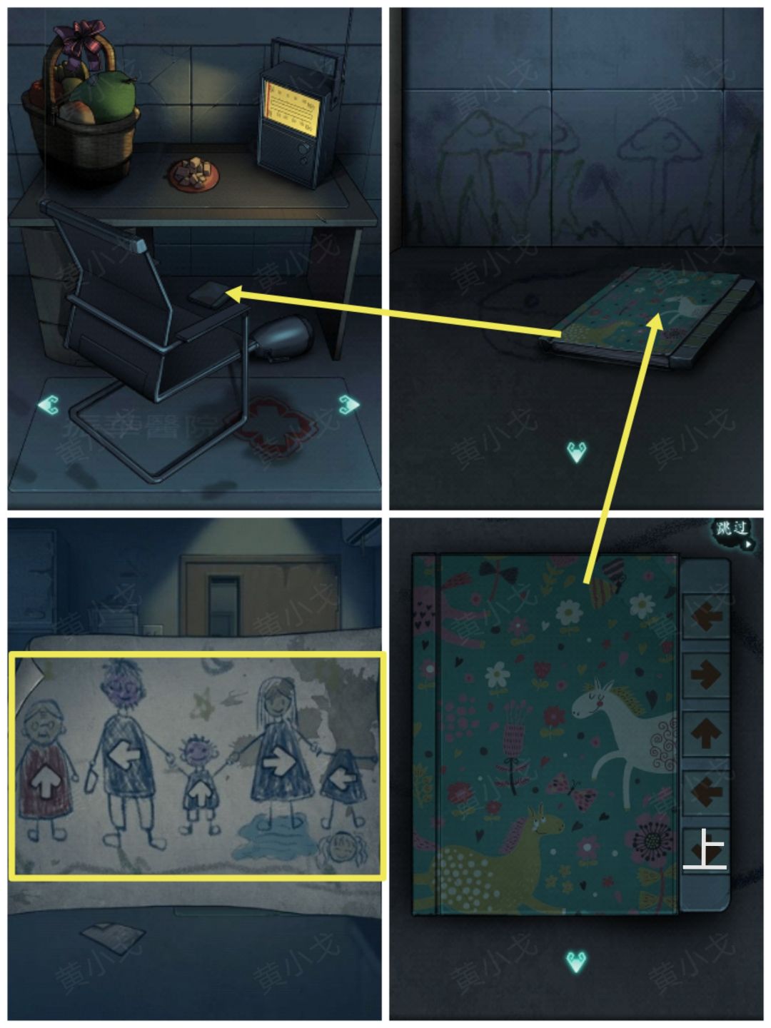 16.(桌子)点击桌子下面的笔记本,根据门口纸上的线索,调整密码锁上的箭头(从高到低箭头:左←、右→、上↑、左←、上↑)