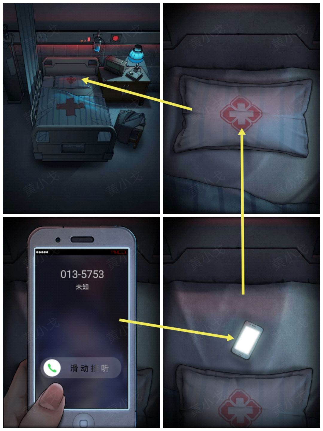 1.(病床)点击病床上的枕头,挪开,点击手机,接听电话