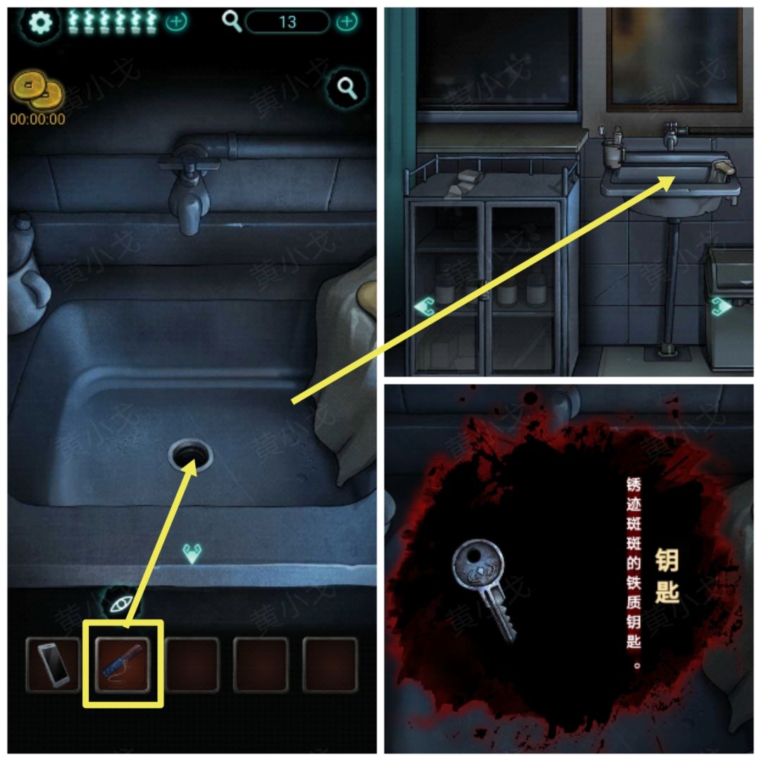 21.(洗手台)点击洗手台,用【清理工具】吸【钥匙】上来