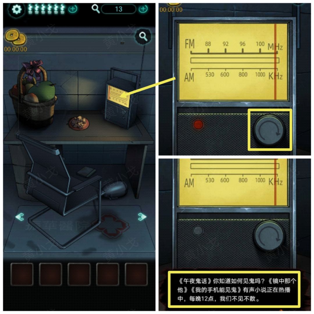 8.(桌子)先去门那里转动门把手尝试出去,会有收音机播放的提示。点击桌子上的收音机,收听所有频道的信息,获得线索(镜中的那个他)