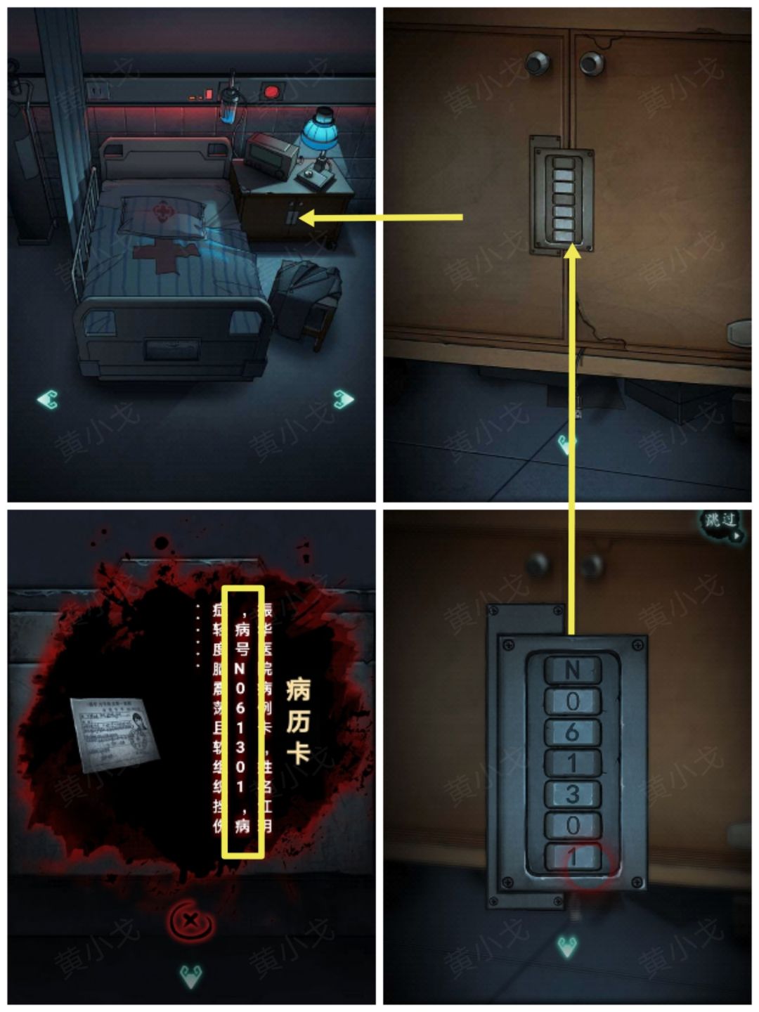 4.点击床头柜的密码锁,根据【病历卡】上的线索,输入密码:N061301(病号)