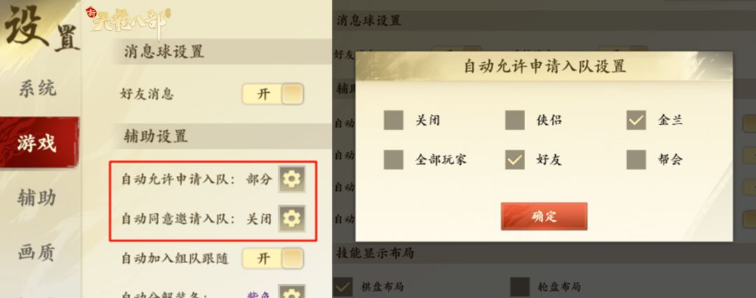少侠可在设置-游戏,打开自动允许其他人申请入队、自动同意其他人邀请入队。也可以选择允许自动入队的范围:如仅勾选【好友】,只有好友才能自动入队。
