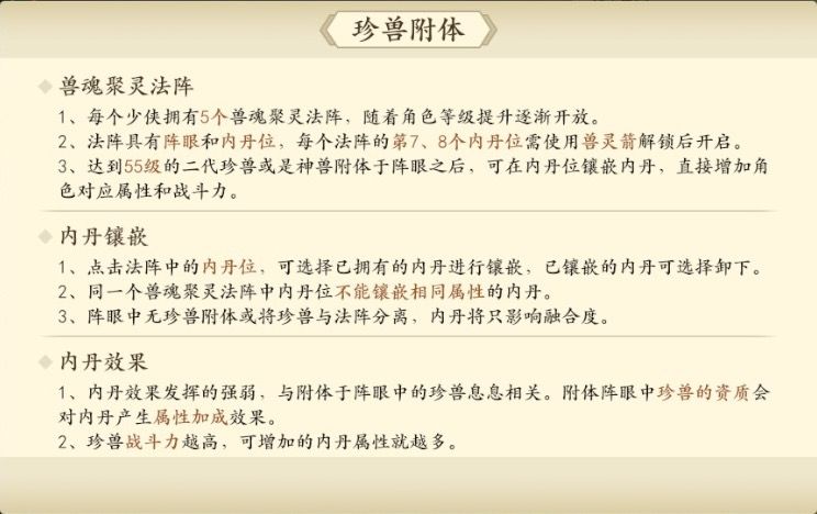 等级55级后会解锁珍兽附体功能,随着角色等级提升依次开放不同阵法55级开启青龙阵、65级开启动白虎阵、75级开启朱雀阵、85级开启玄武阵、95级开启麒麟阵;每个阵可以镶嵌8枚内丹,其中有最后两个内丹孔位需要通过乾坤论武获取兽灵箭后才能解锁,共有十种基础属性内丹和属性攻击、属性抗性、减抗各四种少侠可自由搭配;根据镶嵌内丹的数量、品级和内丹等级获得相应附体融合度,当融合度达到一定数值后可解锁附体特效,附体融合特效还是还原的端游效果。