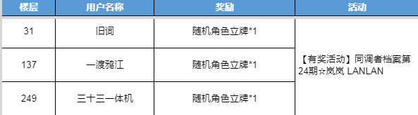 请获奖的监督们进入白荆回廊官方2群(QQ:437101620)私聊@白荆后勤小乙进行兑奖,并发送带ID的个人主页与中奖楼层截图验证身份。领奖时间:获得实物奖励的监督,请在15个工作日内提供正确的收货信息,否则视为放弃奖励。