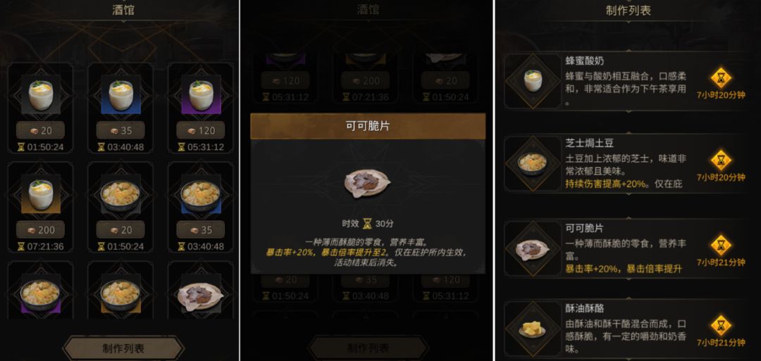 4.酒馆:消耗食物换取buff酒,冒险中强敌狩猎,大门中灾厄挑战均适用,并非购买即可使用,制作需要时间