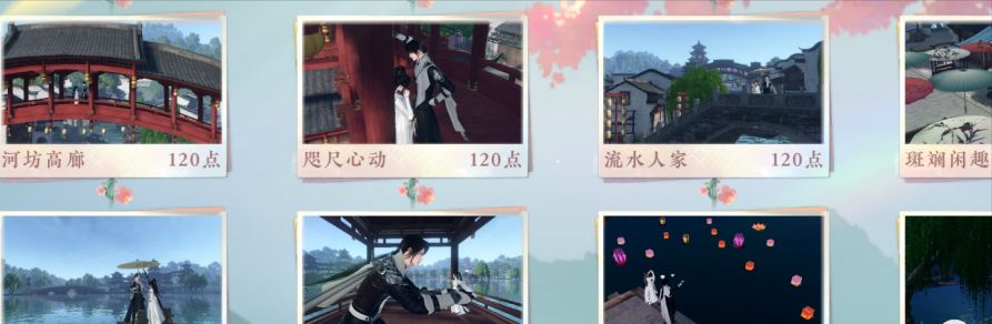 6)镜湖情缘打卡点:镜湖(781,343),镜湖(402,539)是在最高层上面。镜湖(722,385)在小木船上;镜湖(770,245),镜湖(382,333),镜湖(311,374)在最上面一层的屋里,得用轻功跳上去。