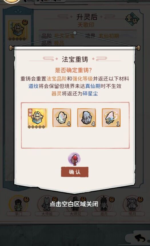 - 升灵后的本命法宝现在可以在升灵阁中重铸,消耗道具[天阳晶]将法宝恢复为初始状态,并返还部分材料。