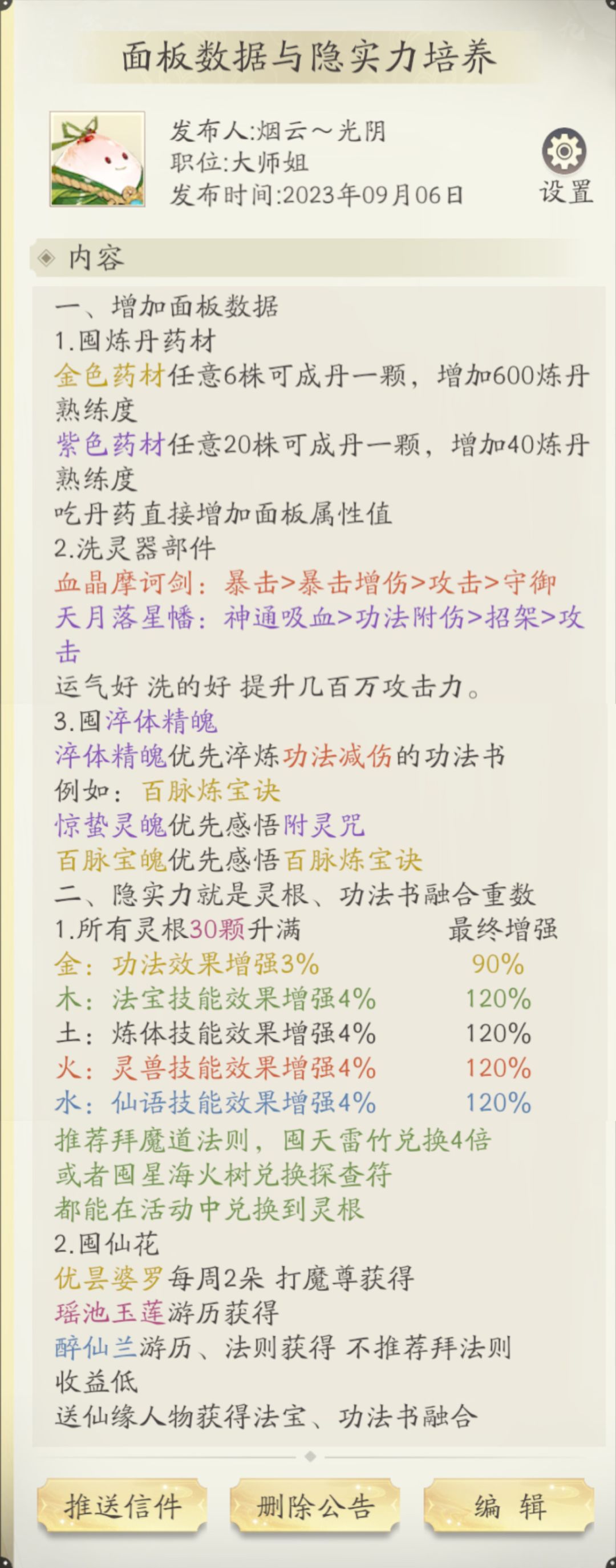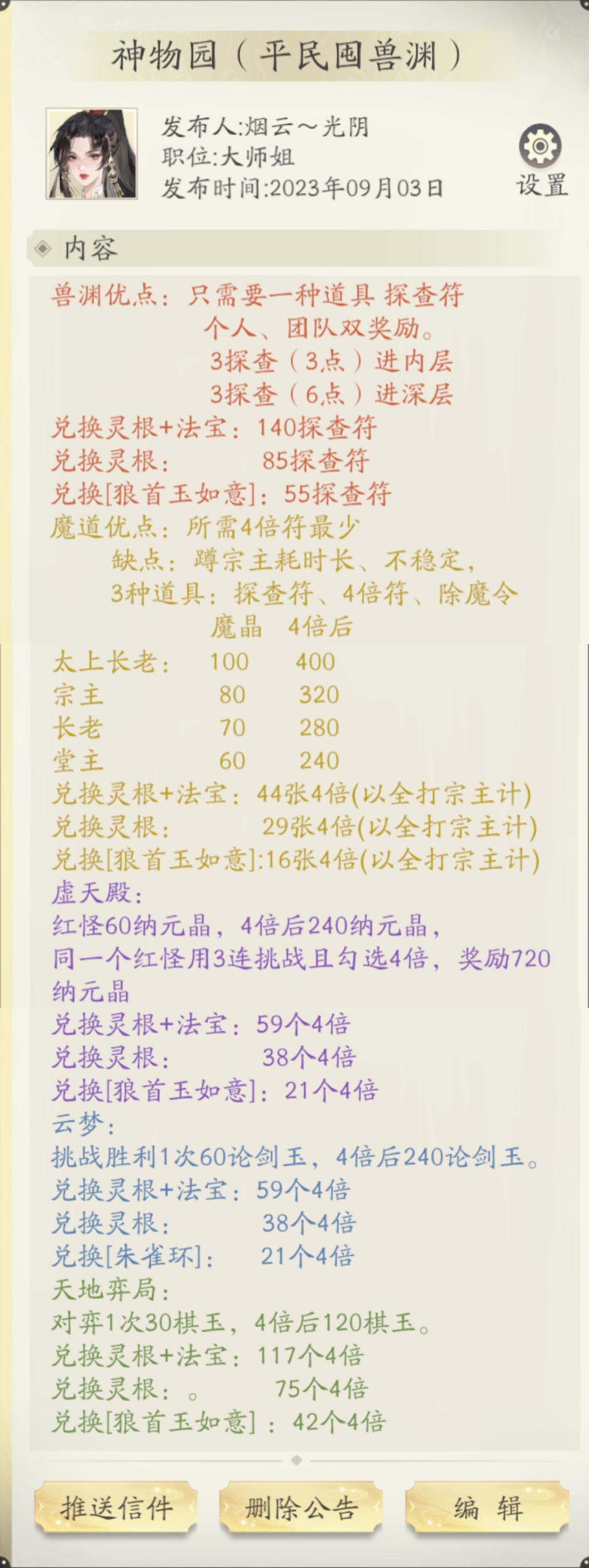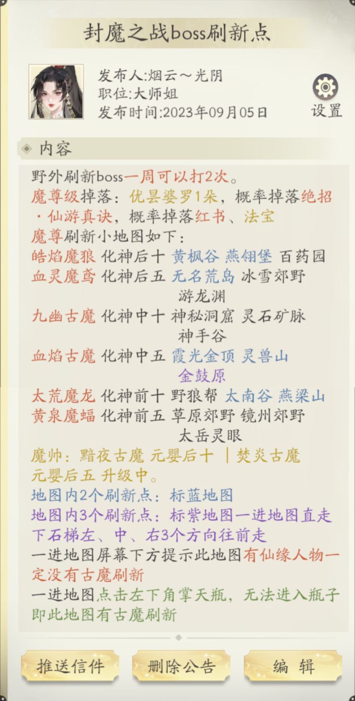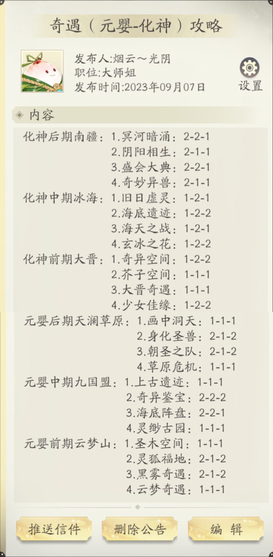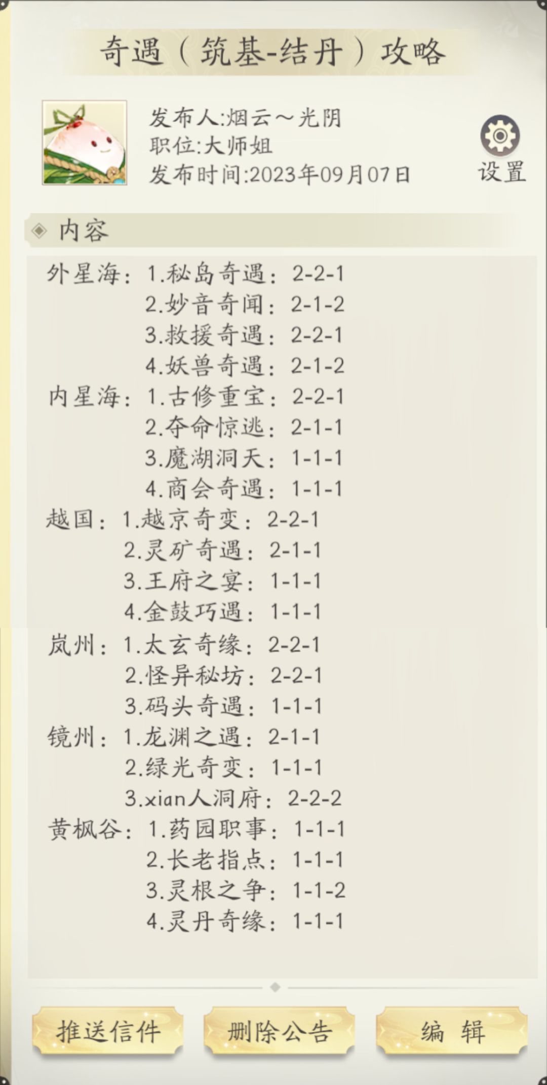 目前我化神中期九层,升到化神后期应该就用的上奇遇攻略了,为了在游戏内看到答案,就把奇遇攻略也做成家族公告了。