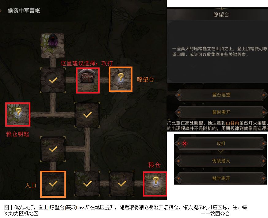 关卡难点:限时60s同时压低双弓手与队长血线70%,6豆秒,上述为正常打法,还有一种如果实在60s无法击杀上图区域,则选择带着粮草后,直接去左侧4区域随机选择潜入,碰4分之1机会直接打最终boss,最终boss同雷夫人打法