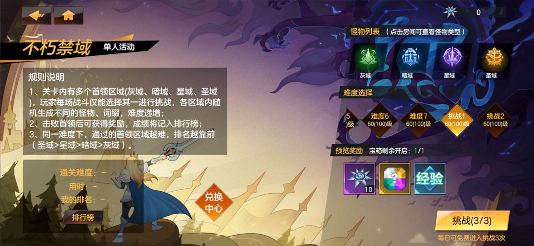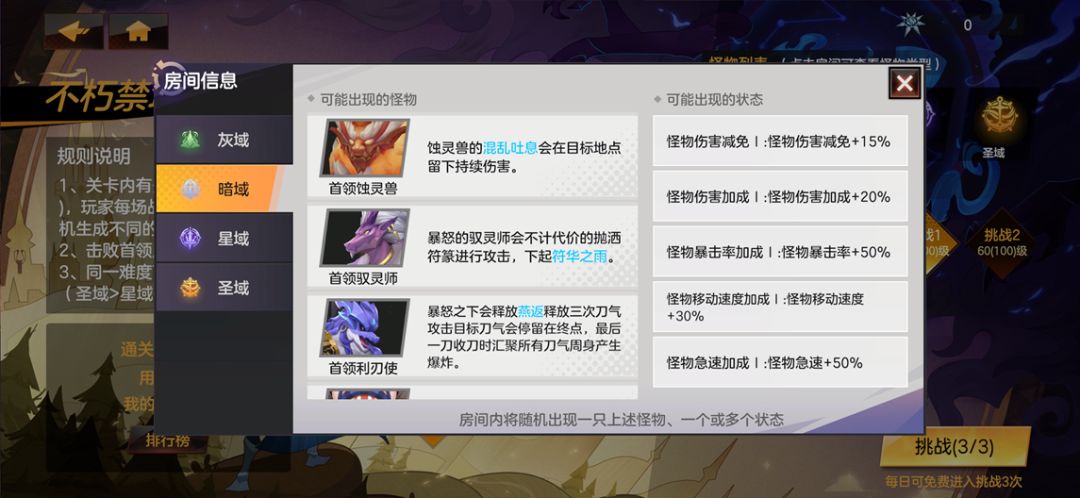 - 不朽禁域内有多个首领区域(圣域、星域、暗域、灰域),各区域内会随机生成不同的怪物和怪物词缀,玩家每场战斗仅能选择其一进行挑战;