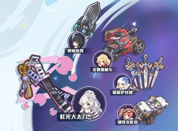 1)卡池UP核心:无瑕-虹光大太刀、判罪-末日审判、露易丝-炎爆重机车、雪儿-蔷薇护封剑、宁芙-钢铁支配者