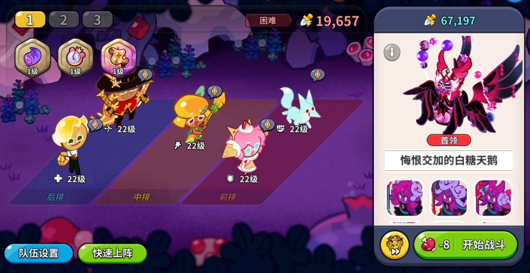 本期小怪阵容和首领阵容推荐均是技能未升级,配料未携带的超级稀有饼干,通关较为极限。