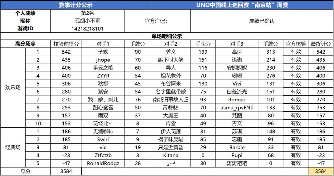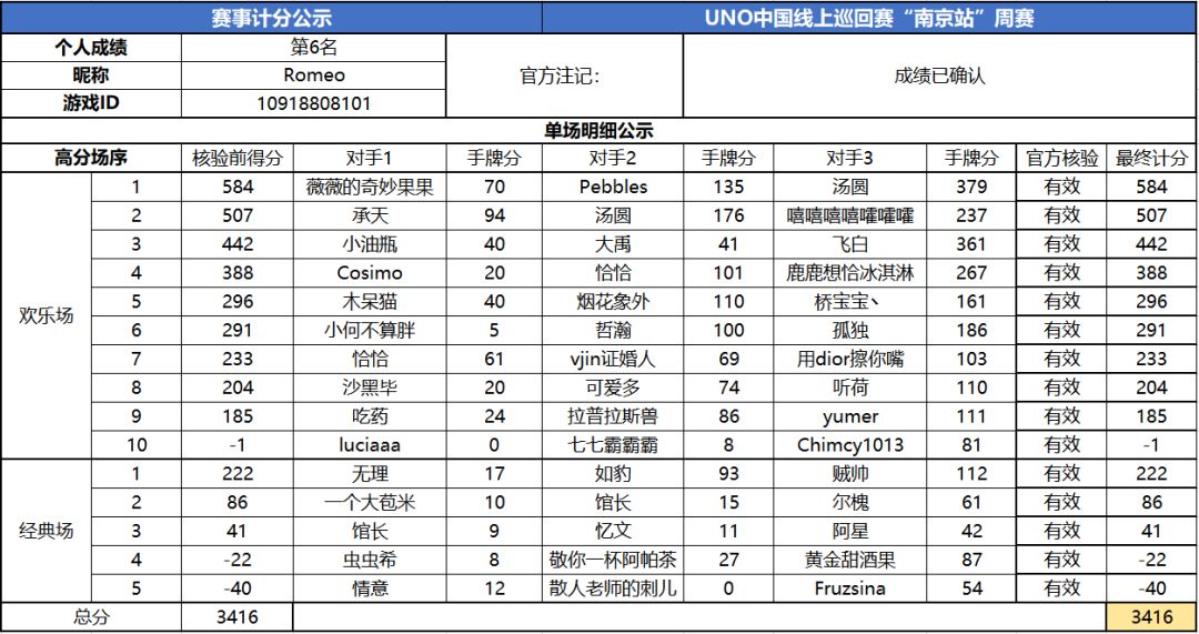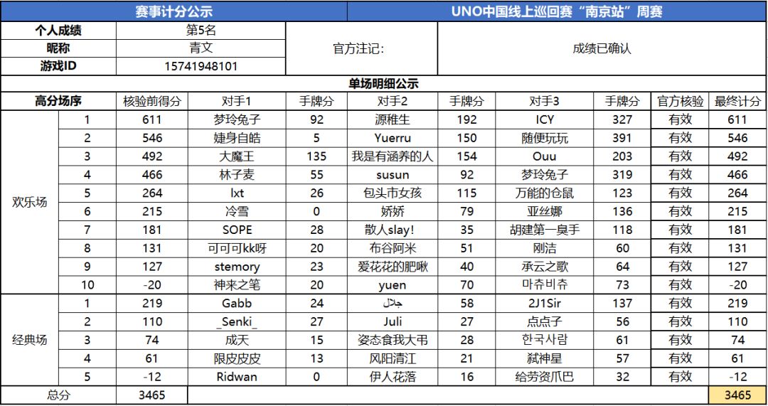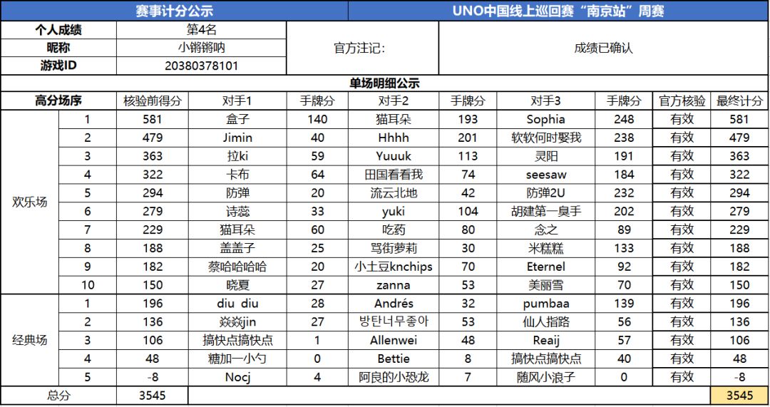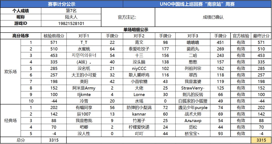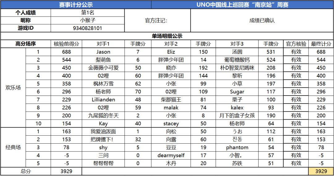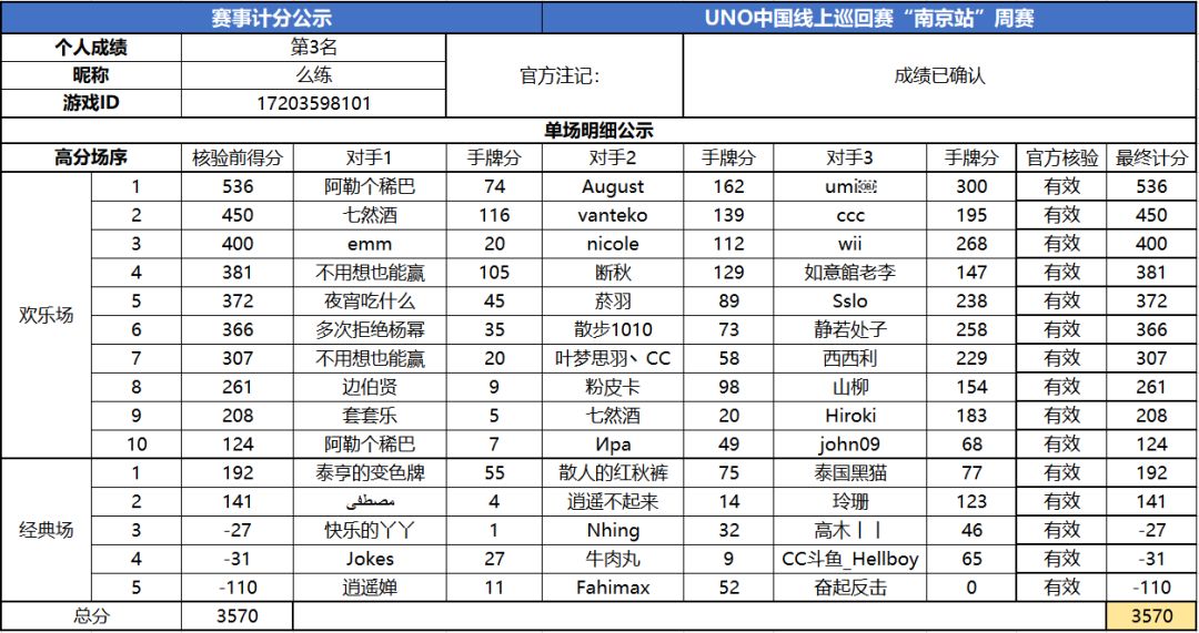 以上就是2020UNO线上巡回赛“南京站”周赛的战报内容啦,为了保证我们巡回赛的公平公正,根据规则,至少完成10场欢乐场及5场经典场的玩家才会判定完成本站巡回赛,而利用多开或其他违规操作的选手我们也会取消本次巡回赛成绩。
