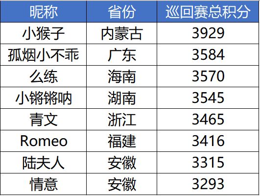 本次巡回赛周赛的冠军,是来自内蒙古的“小猴子”选手,共获得3929分!自从“夏天杯”月塞上青海玩家夺冠后,来自少数民族地区的选手们发挥就异常勇猛——前有新疆玩家多次闯入榜单前三,后有内蒙古玩家夺得周赛第一!这是否意味着,西藏、云南等省份的冠军并不遥远了呢?