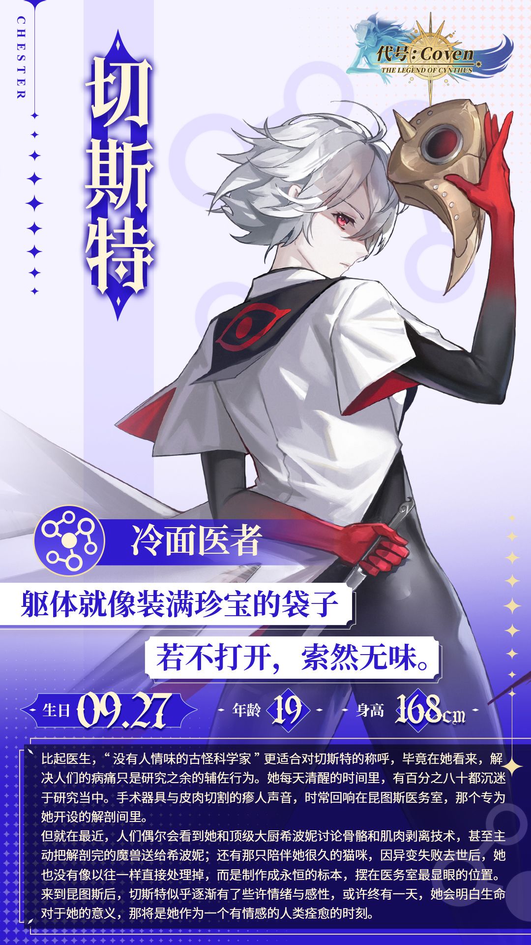 切斯特跟随守墓人父亲长大,所以死人和死亡从不会让她感到可怕,反而比起活生生的人更加吸引她。毕竟尸体会乖乖任她拆解,活人却有数不清的烦恼和顾虑。生病了吃药、坏死了切除……这些简单且符合“逻辑”的方案,会从切斯特嘴里以最平静理性的口吻提出,无论它们听起来多么吓人。虽然被李澜秋老师推荐为学院的常驻医师,帮助师生解决健康问题,但切斯特的冷漠性格、不通人情总会让魔女们难以接近。如果你伤心难过地大哭,她只会面无表情地给你一针镇定剂,而不是一个温暖的拥抱。