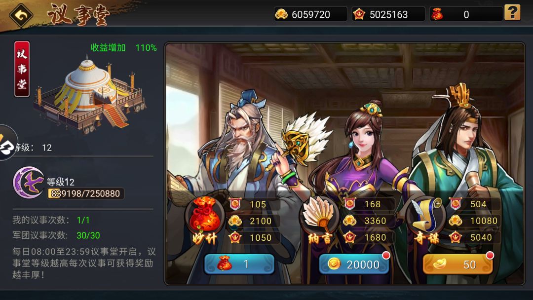 通过不同方式议事,军团成员不单能为军团建设持续贡献,同时收获的粮饷和军功可用于提升武馆特训技能来提升特技。议事堂等级越高,每次议事可获得的奖励越丰厚。目前议事分为锦囊议事、金币议事和元宝议事,其中金币和元宝议事,每天只能选择其中一种方式,而锦囊议事没有次数限制。为了快速提升军团等级,一些军团也会建议成员多选择元宝议事和锦囊贡献。